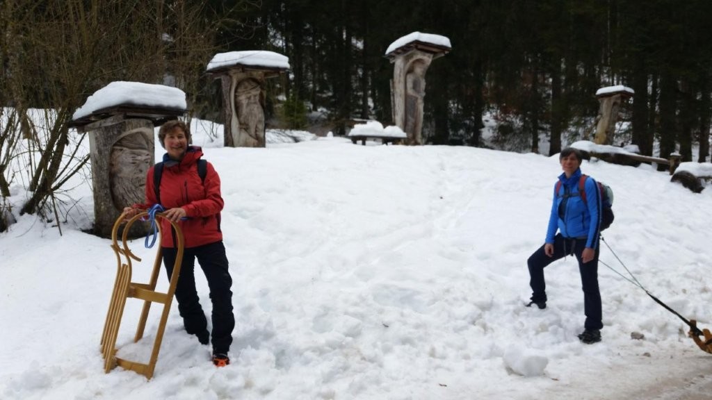 Nach einer gemütlichen Einkehr, gingen wir das kleine Stück zu unseren Schlitten und was dann kam, hätten wir heute Morgen nicht zu hoffen gewagt. Es supertolle Abfahrt mit griffigem Schnee, die einfach nur Spaß machte – juhuuuu! Und weil es so eine Gaudi war, beschlossen wir nach einer kurzen Sonnenpause, dass wir das Stück ab Abzweig Buchsteinhütte einfach nochmal raufziehen.