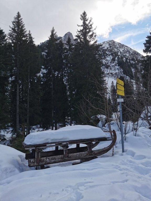 Ich hatte mich für die Buchsteinhütte bei Kreuth entschieden. Der Weg entlang der Schwarzentenn bleibt wegen des Baches oft lange gefroren. Dann würden wir zumindest dieses Teilstück rodeln können. Teilweise war der Weg stark vereist, aber das Gefälle ist sehr sanft, so dass ich sicher war, dass die Schlitten hier gut und auch sicher laufen würden.